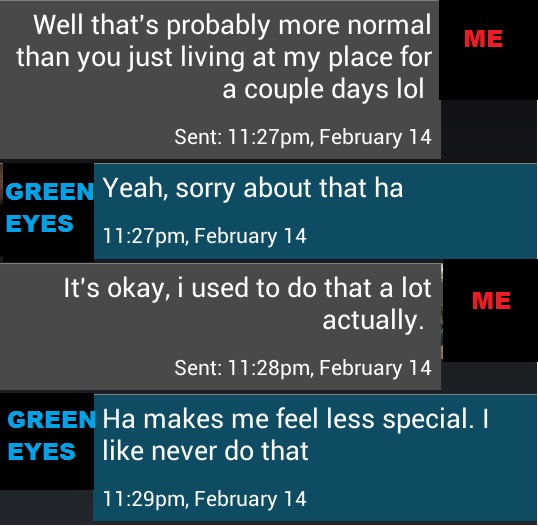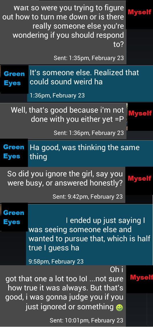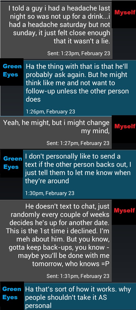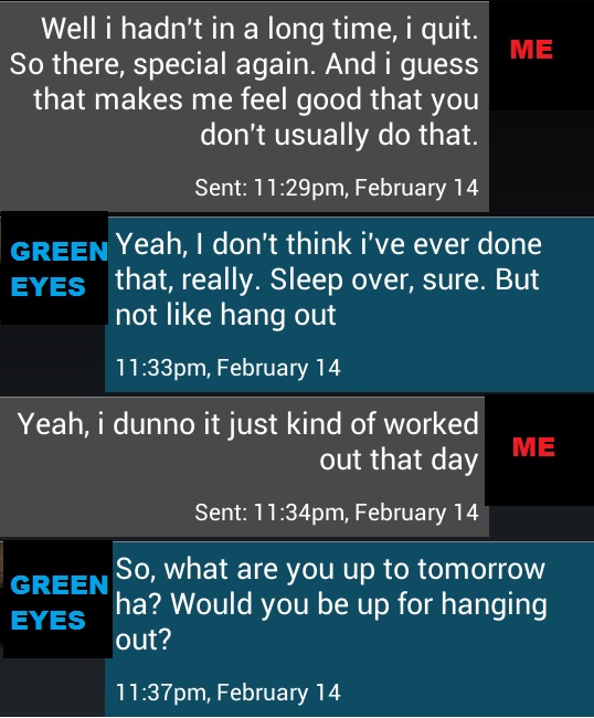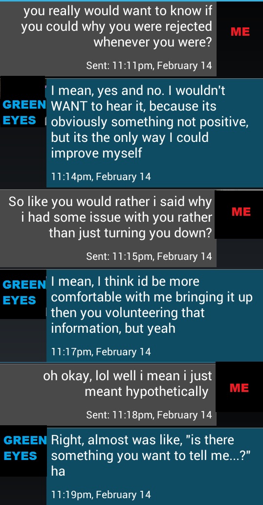 I feel like I haven’t reached a third date in quite a while. Green Eyes and I have continued to text each other since our 19-hour second date. Every now and then I’ll give it a “playing hard to get” spacer day, and sometimes I think he does the same. Of course, neither of us are ignoring one another if the other initiates a text first. We don’t agree on everything, and he doesn’t share my exact sense of humor, but at the same time we seem to enjoy chatting with each other. It happened to be Valentines Day when I did make the mistake of letting him know this blog exists. I don’t usually mention it to many people –let alone someone I’ve written about- but I dropped in a quick mention of it’s existence when discussing how often I write. I’d hoped the conversation would continue glazing over that tidbit, but immediately he began to question if I’d written about him. One thing lead to another in the conversation, and he was feeling uncomfortable with the idea. I tried to explain that it wouldn’t be like I was out with him to document his every move, and suddenly I felt that the “IF” in his “if we meet up again” sounded a lot louder. I’m hoping he’ll let himself forget about it, as it hasn’t come up again. But then that night the conversation shifted towards another uncomfortable place when we discussed whether or not one would want to know the reason they’d been rejected. I’d had his “meh” kiss in mind during this, but it’s really more of an in-person discussion if it’s going to be had at all…