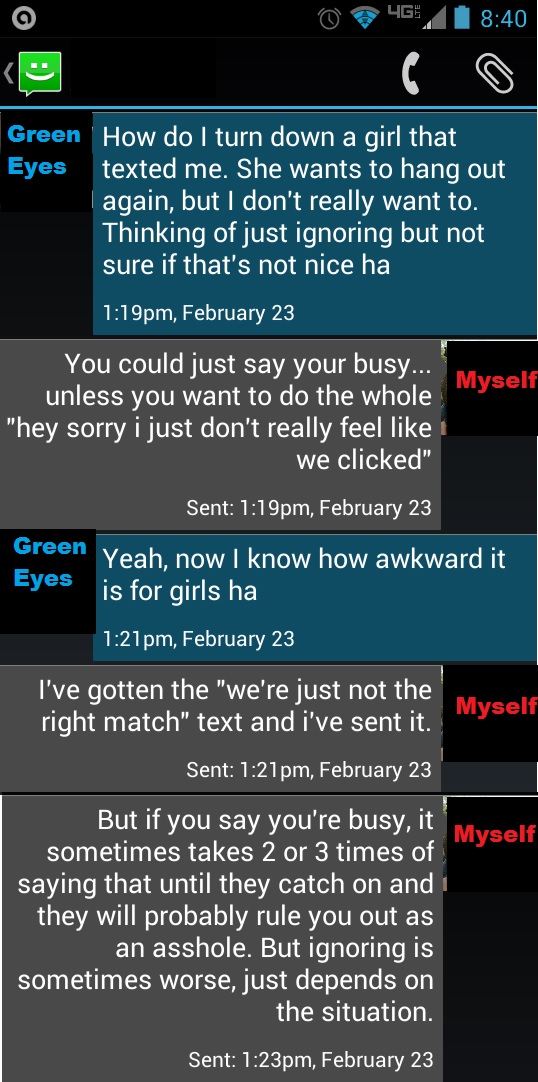 “When are we meeting up?” the date I wasn’t attracted to texted me. I spent a couple of hours thinking about what to say. Usually I tell them I’m busy until they stop asking. I couldn’t just go ghost on him. It would be worse than turning him down. But does anyone really enjoy rejecting someone who didn’t really wrong them in any way? I know how shitty rejection can make me feel no matter who it comes from, but even more so when it’s someone I have any interest in. I decided the least information I gave the better. Hopefully he wouldn’t ask. We’d only met once, neither of us had vested that much time into anything, it was perfectly acceptable to turn him down, except it always ruins my day when I do it. I went with four words- “Sorry, I lost interest.” It was true. It didn’t specify that I’d lost interest in him or in seeing him or in the suggestion of hooking up with him or in dating in general. But he’d still get it. After a few hours he replied “No prob! All the best!” in two texts. And that was it. It was easier than I thought and I felt good about not continuing to lead him on or string him along. I was also happy I felt confident in my decision.