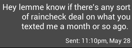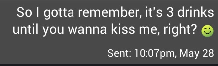 After my text was ignored I got the message. So, I was home on a weeknight three drinks in, back to nothing “romantic” going on in my life. I thought about how crappy my dating life had been going lately and then I remembered the person who had inspired this post. He had texted me out of the blue to meet up, when I wasn’t free one night about two months ago. I hadn’t seen him in about 8 months now and started thinking it might be a nice option to have on the table again. Without thinking about it too much more, I sent him this text and yes it was after 11pm:
