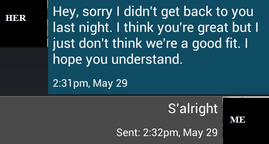 Clearly I’d already received the message or I wouldn’t have texted my old friend the night before, or been back on Tinder so avidly. I would have rather she didn’t reply at all. I feel like that text just sort of made it awkward when it was unnecessary. As much as I always say I’d rather not be ignored and have people be straight forward with me, I think there are still certain times where it’s better when nothing is said. I got her message when she didn’t answer me the night before and it didn’t need to be rubbed in any further. If she hadn’t said anything about ignoring it, maybe we could’ve even been friends. That’s something I don’t like about online dating or Tinder dates. In the real world you can get to know someone without having to be on a date with them. You can start out as friends and see where it goes. When you meet someone from a dating site, the first time you meet it’s your first date. You can say you’re not going to call it that, but you always know it’s a date. By the second date if you know you’re not compatible with one another you basically have to break up. Being friends after a break-up generally has some difficulties. Although you’re on a much less intense level of breaking up, that awkward tinge remains. Maybe we could’ve laughed off my message and hung out again at some point if she hadn’t sent that totally “it’s not you it’s me” kind of text. It’s not so easy to come back leaving it off that way. I still think it would be fun to hang out with her though, do you think I should try asking about a friendship with her in a couple of weeks?
